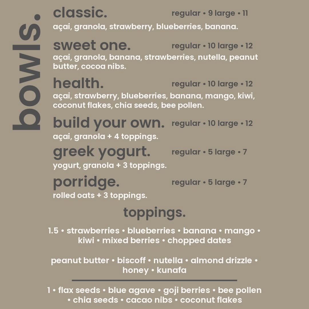 we’ll be providing all the bowls - açai, porridge and your favourite greek yoghurt. step inside and find a selection of our favourite healthy and naughty options. feeling defiant? we’ve got you covered at every angle with all bowls being fully customisable.